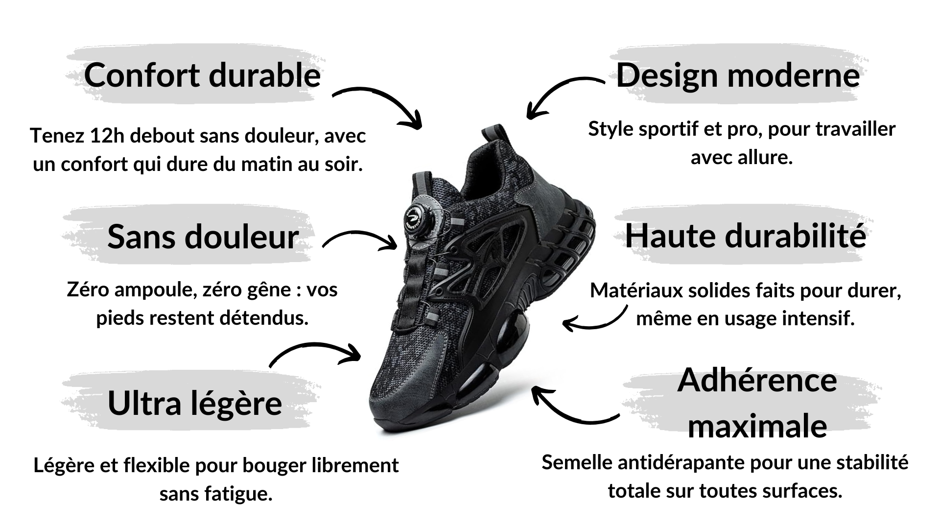 Fini les douleurs : légèreté, amorti et maintien pour tenir 12h sans souffrir.