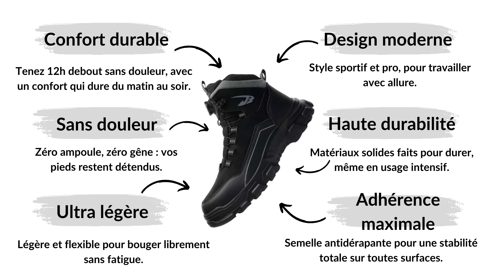 Fini les douleurs : légèreté, amorti et maintien pour tenir 12h sans souffrir.